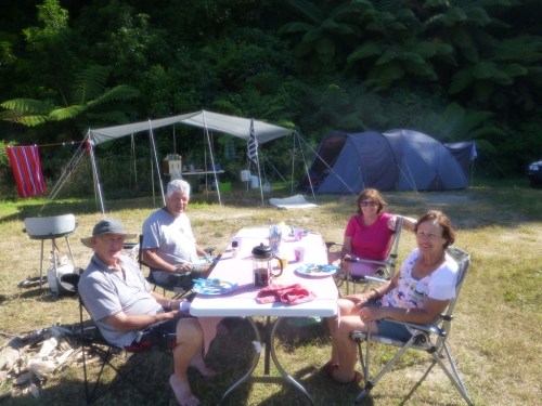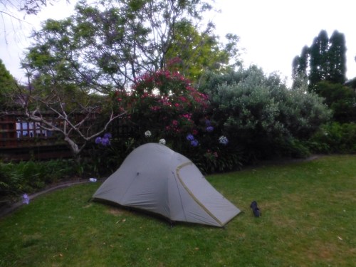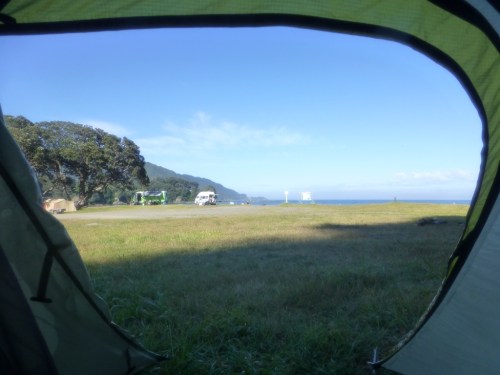 The wind has died down and I'm pretty pumped about the scenery so I find some sort of second wind and keep pedaling. I make it to Whanarua Bay and that energy is gone, so I pull in to the cheap beach camp to set up here. I find a quiet corner, reasonably shielded from wind and the morning sun next to two older couples encampment and pitch tent. I'm famished at this point so before I even put things in my tent I walk to a cleared patch of grass to fire up my gas stove and make dinner.